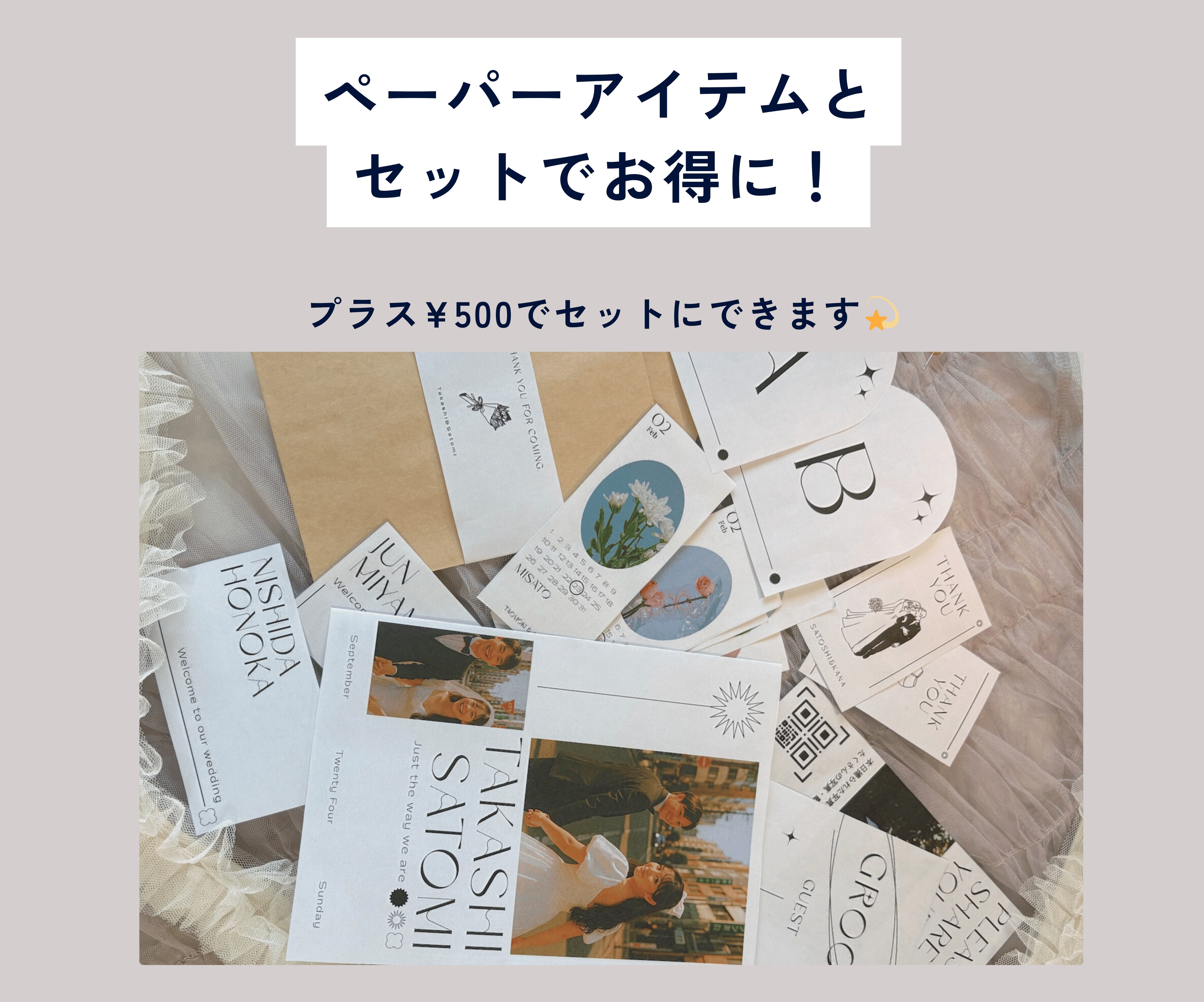 プロフィールブックと合わせた世界観を作れるペーパーアイテムをお得に購入できるセット商品もございます。